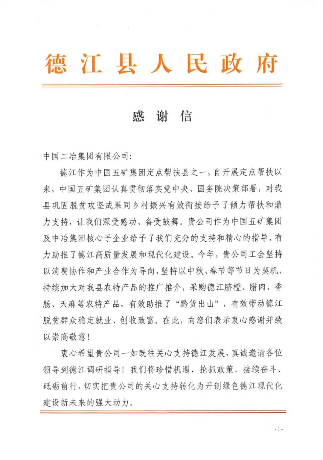 1月20日,中國二冶收到貴州省銅仁市德江縣人民政府感謝信,對中國二冶在助推“黔貨出山”,帶動德江脫貧群眾穩定就業、創收致富方面作出的貢獻表示感謝。