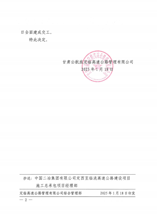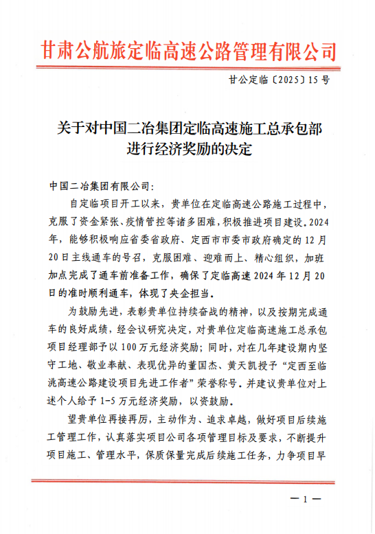 獎勵決定指出:自定臨項目開工以來,中國二冶集團項目管理團隊克服了資金緊張、疫情管控等諸多困難,積極推進項目建設(shè)。2024年,能夠積極響應(yīng)省委省政府、定西市委市政府確定的12月20日主線通車的號召,克服困難、迎難而上、精心組織,加班加點完成了通車前準備工作,確保了定臨高速在2024年12月20日準時順利通車,體現(xiàn)了央企擔當。