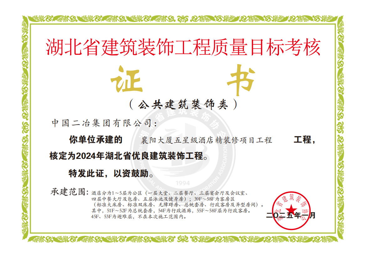 近日,湖北省建筑裝飾協會發布2024年度“湖北省優良建筑裝飾工程”評選結果,中國二冶襄陽大廈五星級酒店精裝修項目榮獲2024年“湖北省優良建筑裝飾工程”。