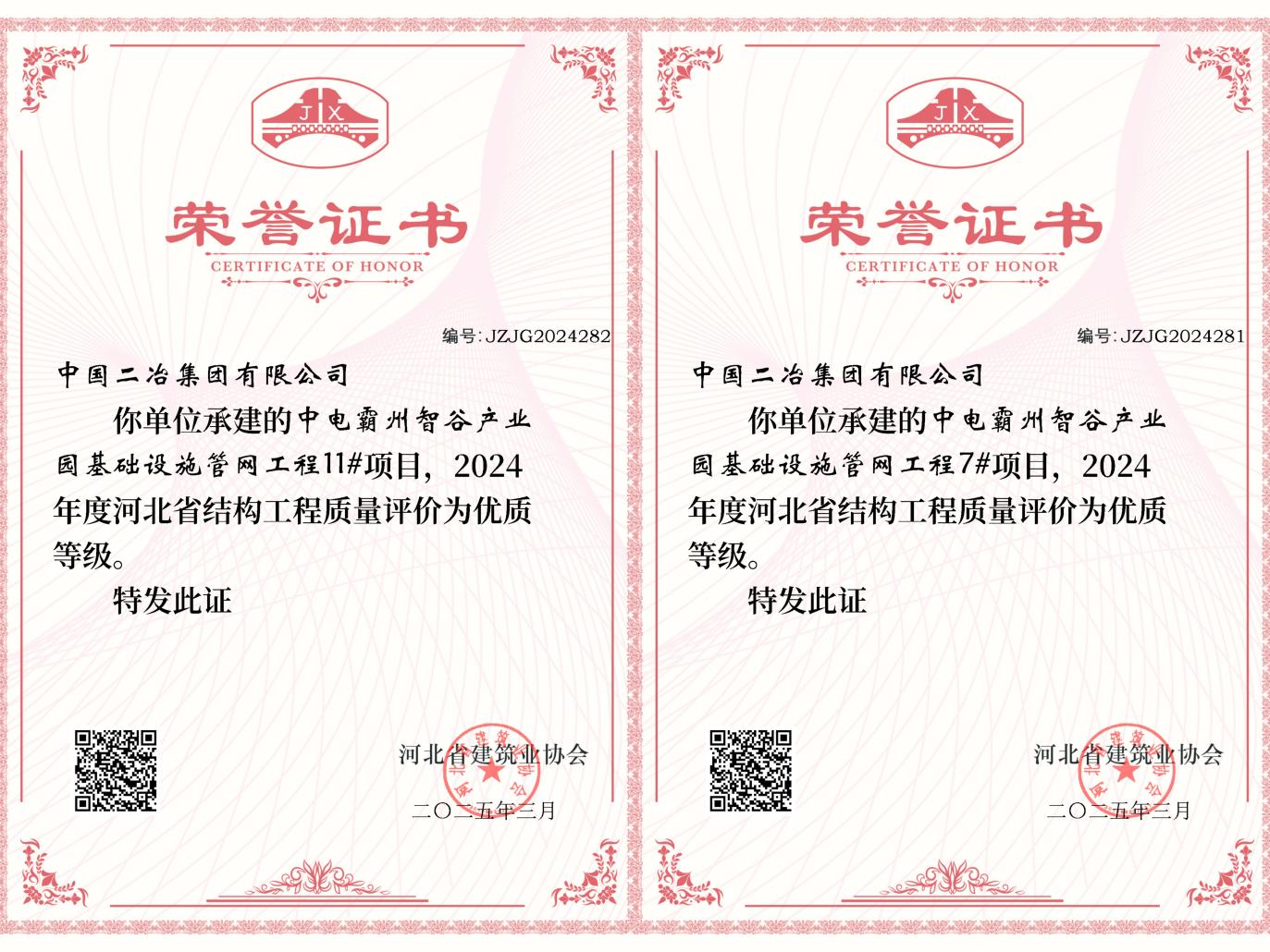 近日,中國二冶霸州中電智谷項目7#、11#樓獲評2024年度河北省優質結構工程。