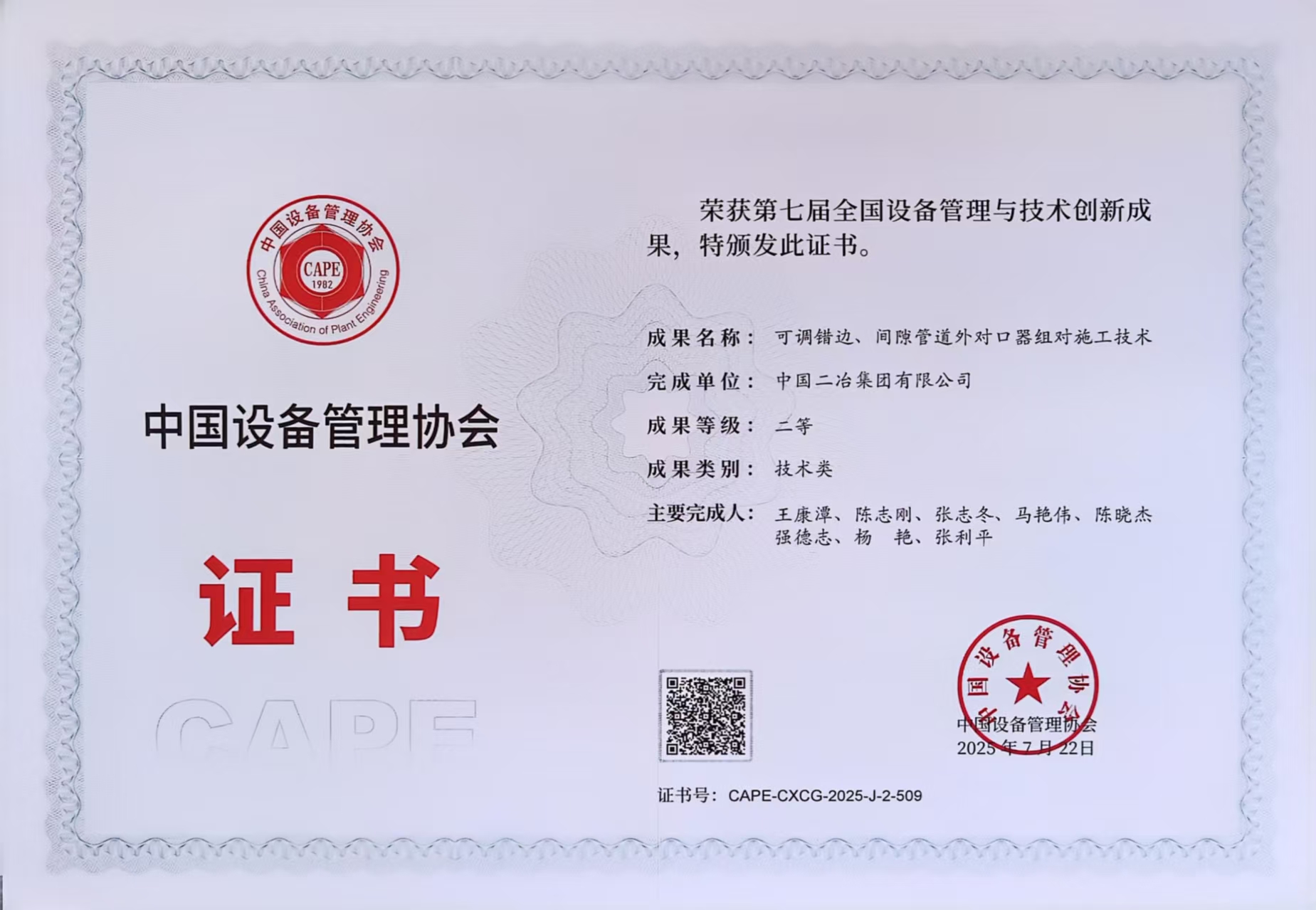 7月22日至23日,第七屆全國設備管理與技術創新成果交流大會在南京舉行。中國二冶申報的《可調錯邊、間隙管道外對口器組對施工技術》從2418項科研成果中脫穎而出,斬獲第七屆全國設備管理與技術創新成果二等獎。