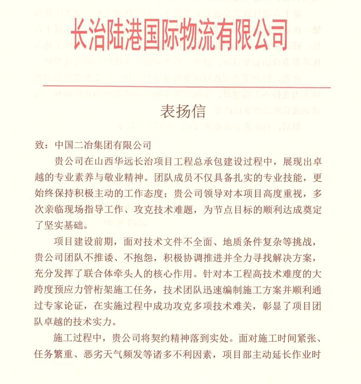 7月23日,中國二冶收到來自長治陸港國際物流有限公司表揚(yáng)信。對中國二冶鋼構(gòu)公司山西長治項(xiàng)目管理團(tuán)隊(duì)攻堅(jiān)克難,順利實(shí)現(xiàn)項(xiàng)目既定目標(biāo)提出表揚(yáng)。