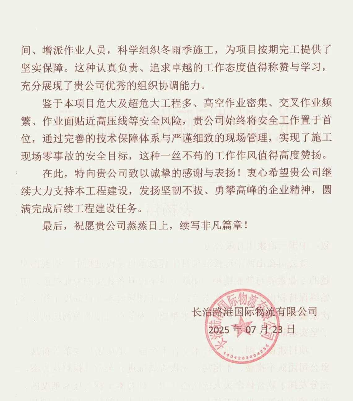 信中指出,工程自進(jìn)場施工以來,貴公司領(lǐng)導(dǎo)對本項(xiàng)目高度重視,多次親臨現(xiàn)場指導(dǎo)工作、攻克技術(shù)難題,為節(jié)點(diǎn)目標(biāo)的順利達(dá)成奠定了堅(jiān)實(shí)基礎(chǔ)。在實(shí)施過程中,項(xiàng)目管理團(tuán)隊(duì)攻克多項(xiàng)技術(shù)難關(guān),保質(zhì)保量按照計(jì)劃實(shí)現(xiàn)了預(yù)期目標(biāo),彰顯了項(xiàng)目團(tuán)隊(duì)卓越的技術(shù)實(shí)力。特別是施工關(guān)鍵時(shí)期,由于本項(xiàng)目存在危大及超危大工程多,高空作業(yè)密集,交叉作業(yè)頻繁等安全風(fēng)險(xiǎn),為此,項(xiàng)目管理團(tuán)隊(duì)始終將安全工作置于首位,通過完善的技術(shù)保障體系與嚴(yán)謹(jǐn)細(xì)致的現(xiàn)場管理,實(shí)現(xiàn)了施工現(xiàn)場零事故的安全目標(biāo)。