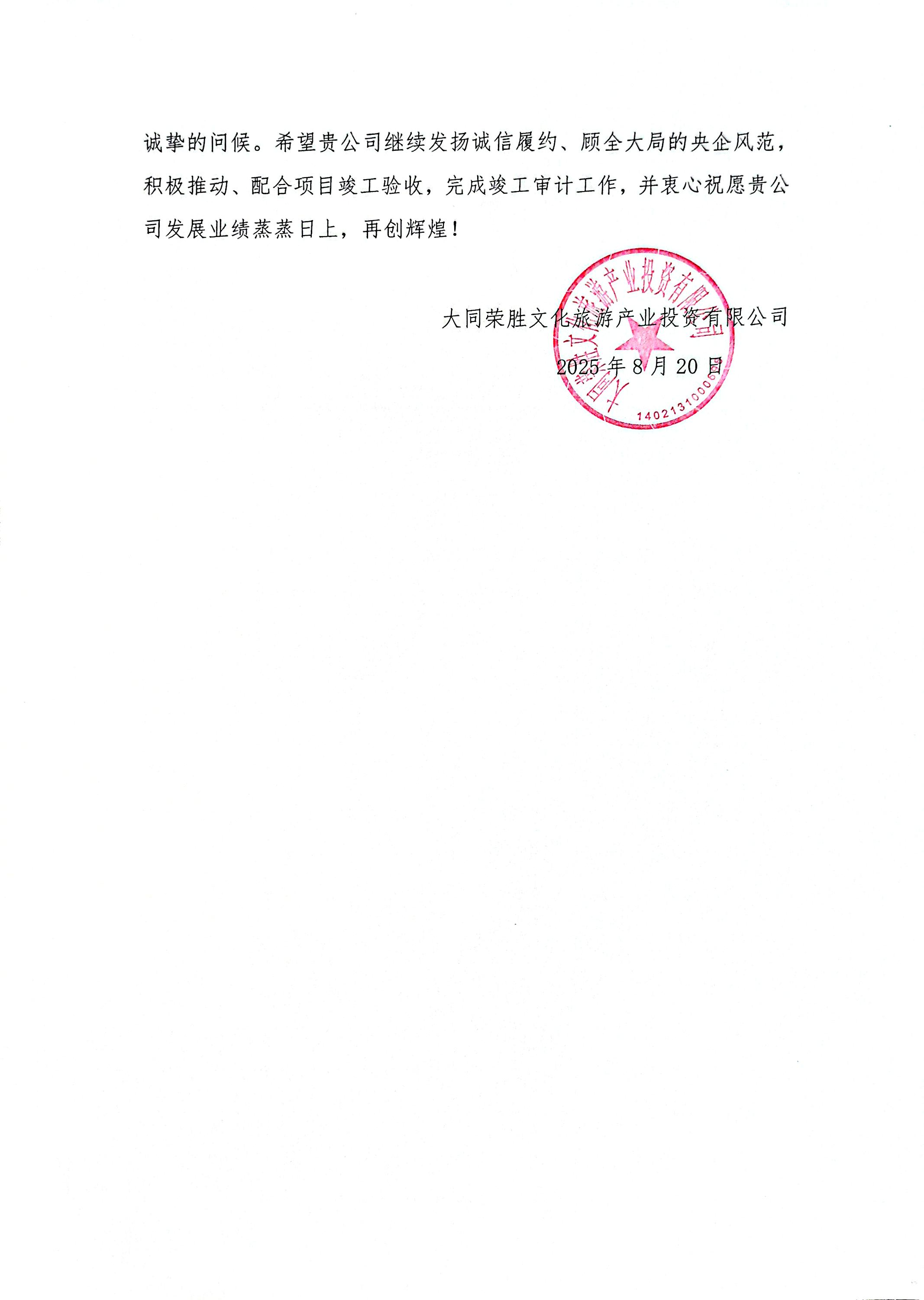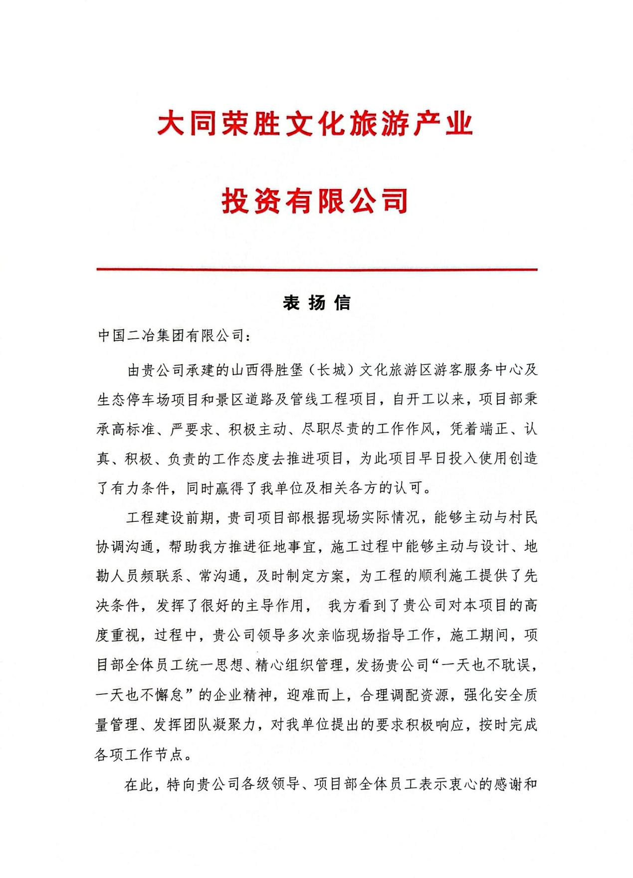 8月21日,中國二冶收到大同榮勝文化旅游產(chǎn)業(yè)投資有限公司發(fā)來的表揚信,信中對中國二冶內(nèi)蒙古分公司在項目建設中的卓越表現(xiàn)給予高度認可。?